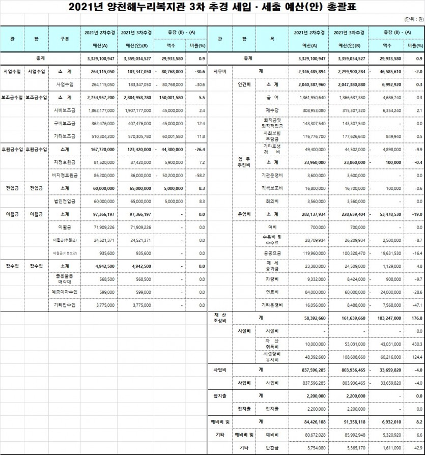 2021년 양천해누리복지관 제3차 추경 세입세출 예산 공고