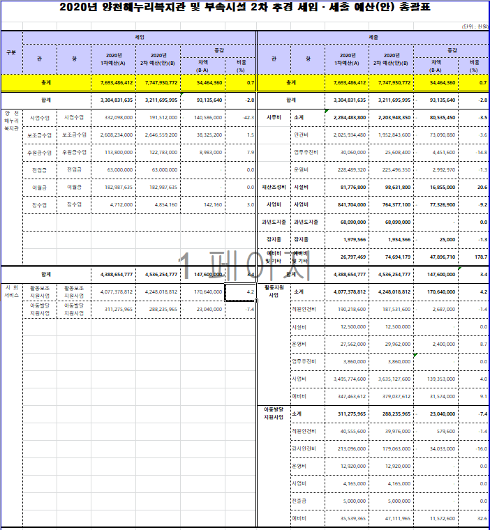 2020년 복지관, 사회서비스 2차 추경 세입세출 예산을 공지합니다.
