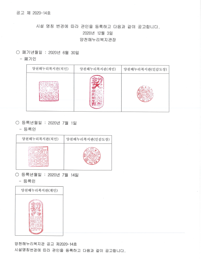 양천해누리복지관 관인변경 공고