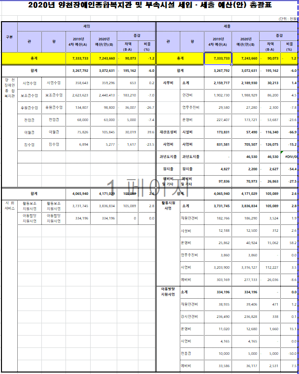 2020년 양천해누리복지관, 사회서비스 세입세출 예산 공고