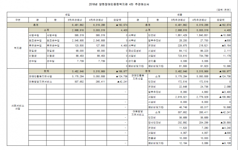 1. 공고내용 : 2018년 양천장애인종합복지관 4차 추경예산서(사회서비스, 공동생활가정 포함)