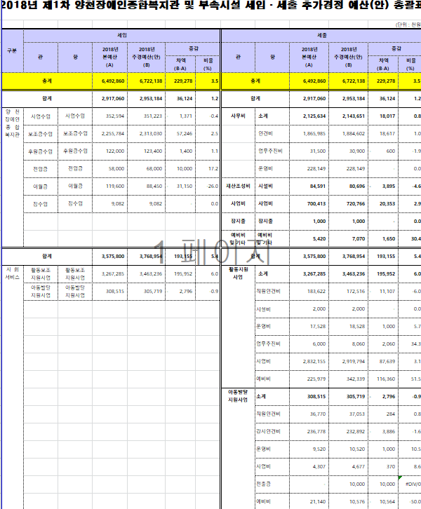 1. 공고내용 : 2018년 양천장애인종합복지관 1차 추가경정예산서 (사회서비스, 공동생활가정 포함)