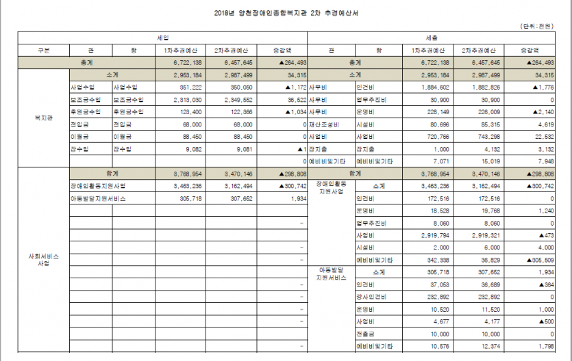 1. 공고내용 : 2018년 양천장애인종합복지관 2차 추경예산서(사회서비스 포함)