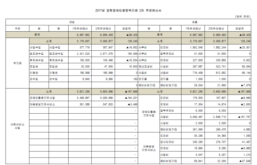 1. 공고내용 : 2017년 양천장애인종합복지관 2차 추경예산서(사회서비스 포함)