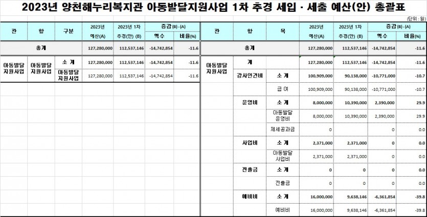 1. 공고내용 : 2023년 양천장애인종합복지관 1차 추경예산서(사회서비스 포함)