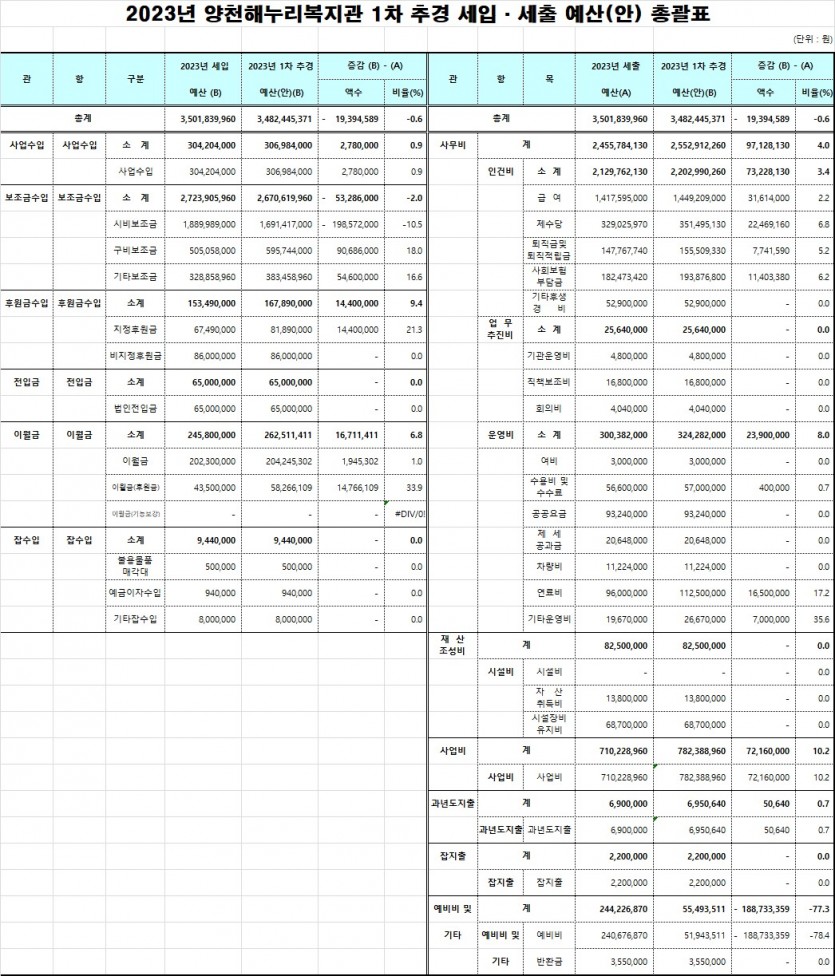 2023년 양천해누리복지관 1차 추가경정예산서 공지