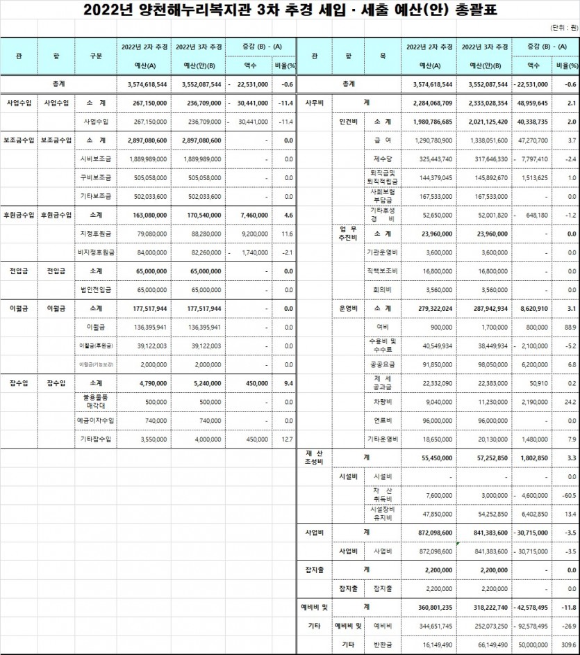 2022년 복지관 제3차 추가경정 세입세출 예산