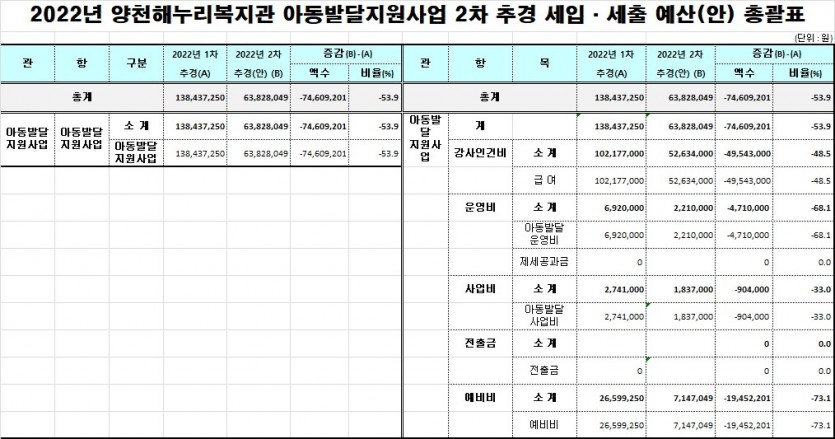 2022년 아동발달사업 제2차 추가경정 세입세출 예산을 공지합니다.