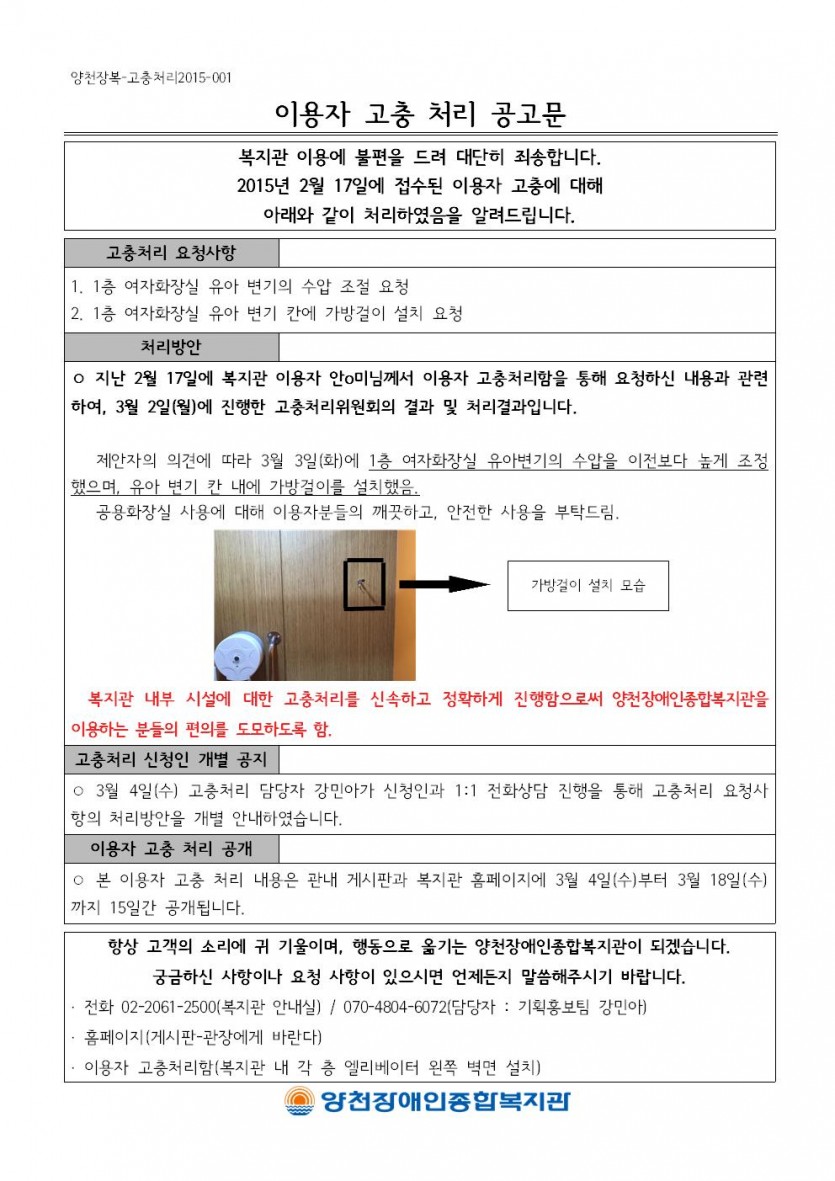 복지관 내부 시설에 대한 고충처리를 신속하고 정확하게 진행함으로써 양천장애인종합복지관을 이용하는 분들의 편의를 도모하도록 함.