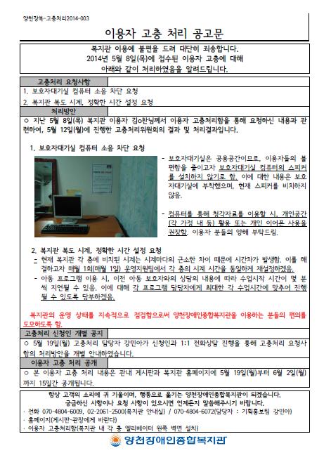 ○ 본 이용자 고충 처리 내용은 관내 게시판과 복지관 홈페이지에 5월 19일(월)부터 6월 2일(월)까지 15일간 공개됩니다.