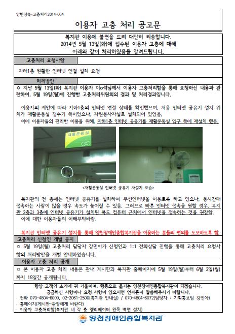 복지관 인터넷 공유기 설치를 통해 양천장애인종합복지관을 이용하는 분들의 편의를 도모하도록 함.