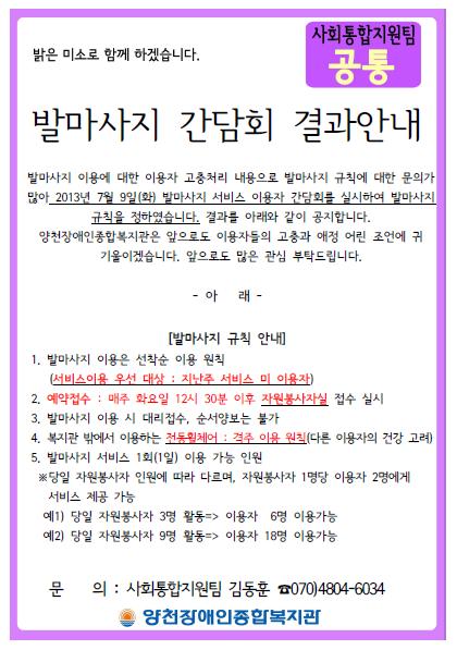「‘발마사지 간담회’를 7월 8일(화) 14:30에 모둠활동실에서 실시」하여 발마사지 운영에 대해 이용자들과 함께 논의한 후, 공지하겠음.