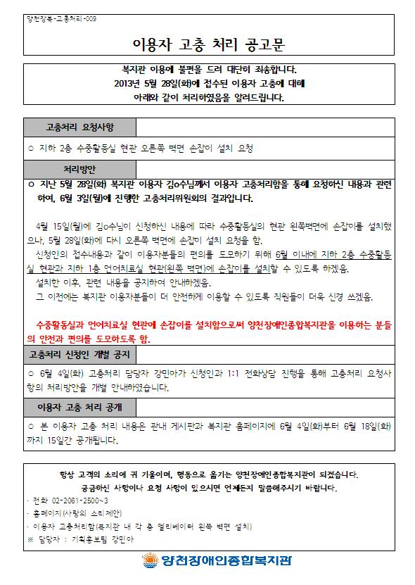○ 본 이용자 고충 처리 내용은 관내 게시판과 복지관 홈페이지에 6월 4일(화)부터 6월 18일(화)까지 15일간 공개됩니다.