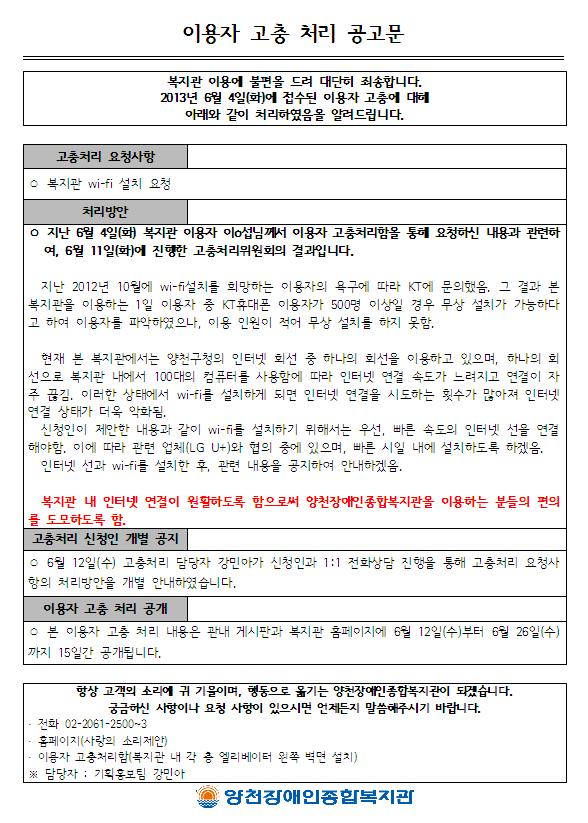 2013년 6월 4일(화)에 접수된 이용자 고충에 대해 아래와 같이 처리하였음을 알려드립니다.