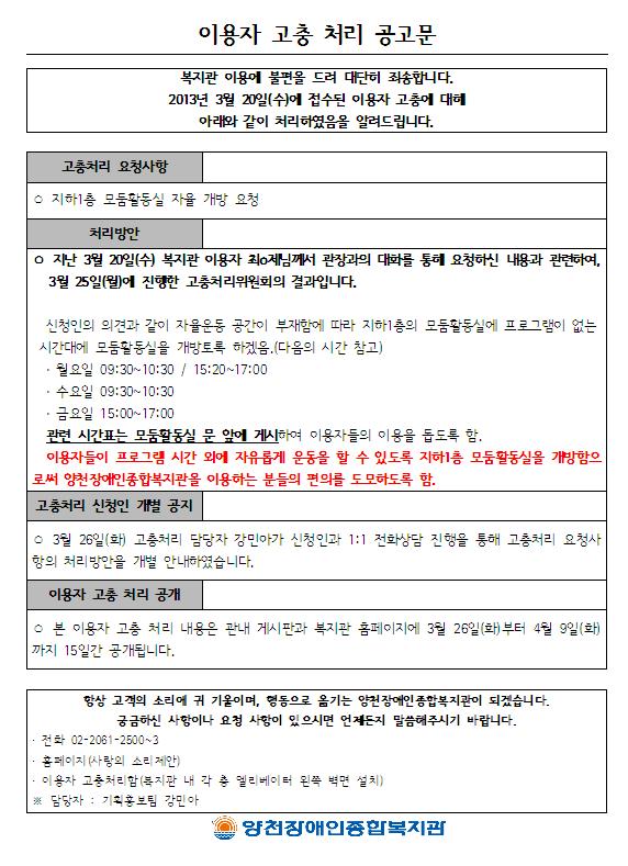 ○ 본 이용자 고충 처리 내용은 관내 게시판과 복지관 홈페이지에 3월 26일(화)부터 4월 9일(화)까지 15일간 공개됩니다.