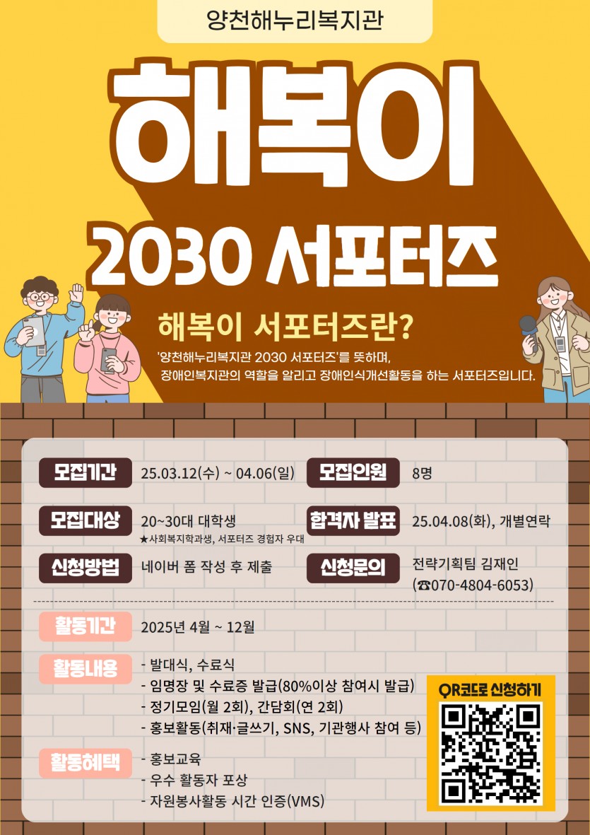 【에이블뉴스 이슬기 기자】 양천해누리복지관이 지역사회에 장애인복지관의 역할을 알리고 장애에 대한 편견을 줄이고자 대학생들을 대상으로 홍보활동을 하는 2030 서포터즈를 오는 4월 6일까지 모집한다.