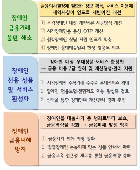 이번 방안은 그동안 장애인 단체 등으로부터 제기돼 왔던 개선 필요사항들을 반영해 ▲장애인의 금융거래 불편 해소 ▲장애인 전용 상품 및 서비스 활성화 ▲장애인 금융피해 방지를 위한 세부 과제들로 구성됐다.