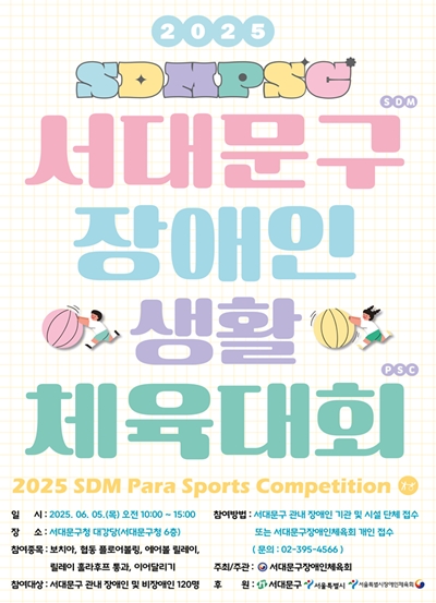 【에이블뉴스 권중훈 기자】서울 서대문구장애인체육회가 오는 6월 5일 서대문구청 대강당에서 지역 장애인과 비장애인이 함께 모여 장애인생활체육종목을 체험해 보고 함께 하는 운동의 기회와 즐거움을 느낄 수 있는 ‘2025 서대문구 장애인생활체육대회’를 개최한다.