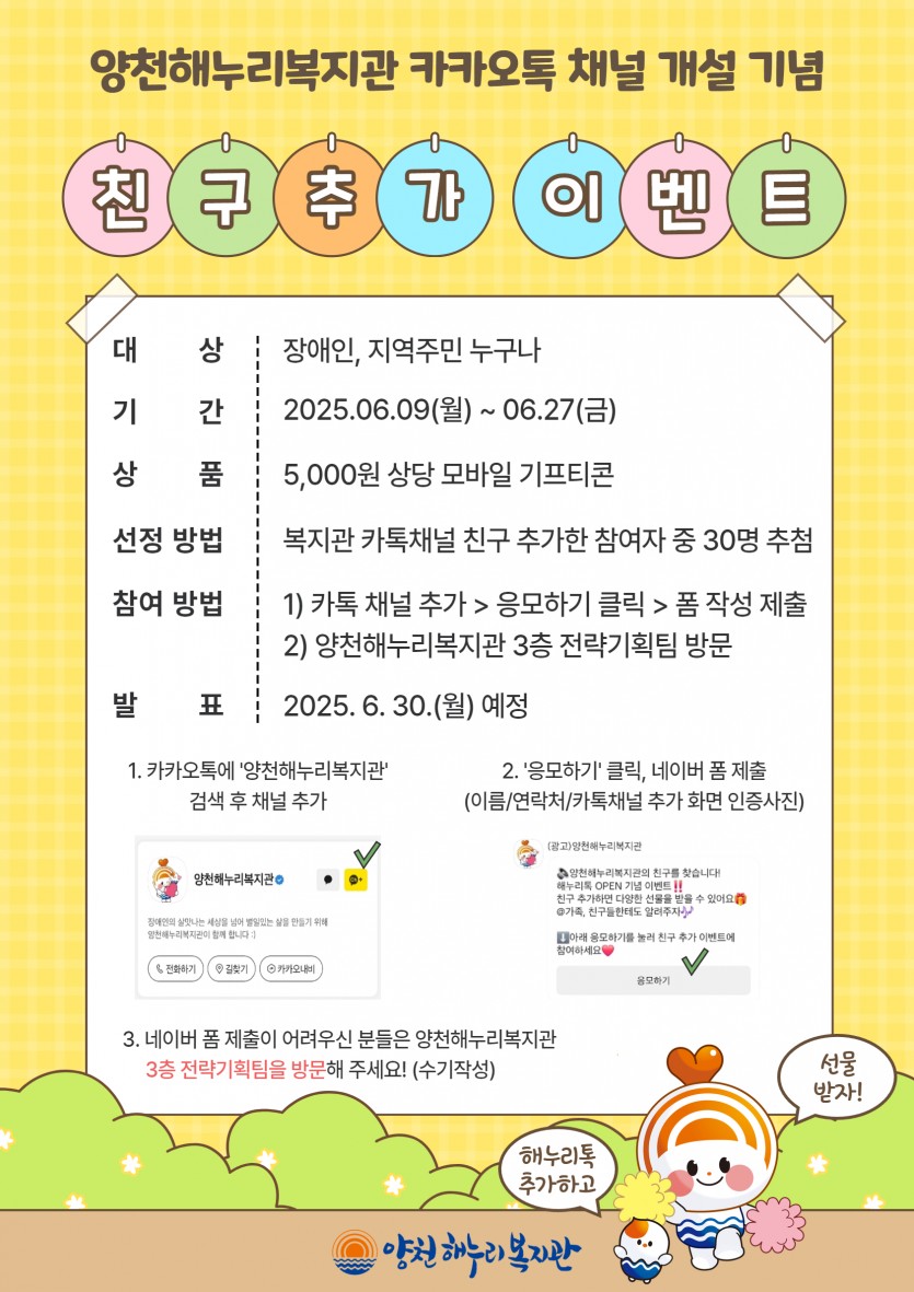 【에이블뉴스 이슬기 기자】양천해누리복지관이 복지관 카카오톡 채널을 새롭게 개설하고, 오는 27일까지 ‘카카오톡 채널 친구 추가 이벤트’를 실시한다.