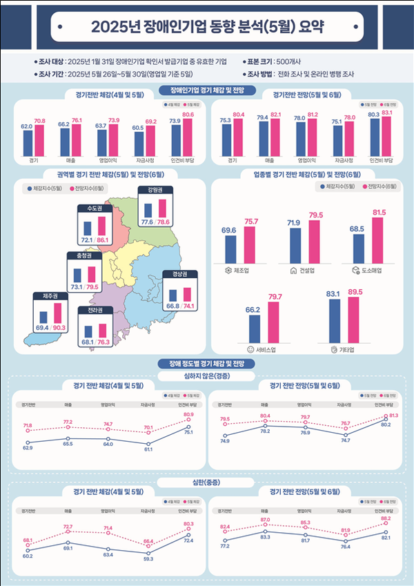 장애인기업의 5월 경기 체감 지수는 70.8p로 전월 대비 8.8p 상승했으며, 6월 경기 전망 지수는 80.4p로 5.1p 올랐다.