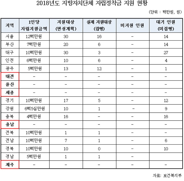 또한 지난해 각 지자체가 장애인자립정착금을 지급하겠다고 편성한 인원은 서울이 40명, 대구 30명, 부산 20명, 충북 20명, 경기 19명 순으로 나타났다.