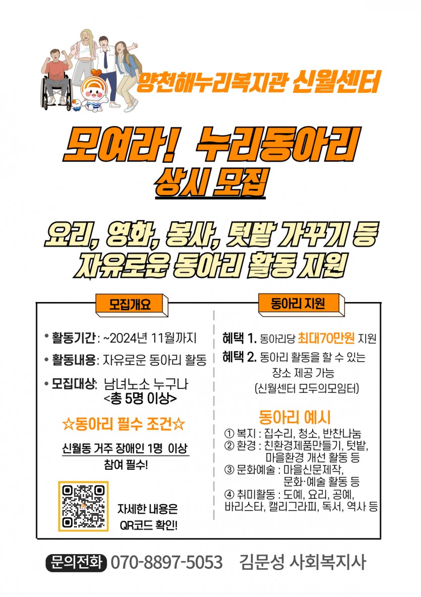 모집 대상은 신월동에 거주 또는 직장을 둔 장애인 및 지역주민이면 누구나 참여 가능하며, 동아리 구성원 중 1명 이상의 장애인을 포함해 구성돼야 한다.