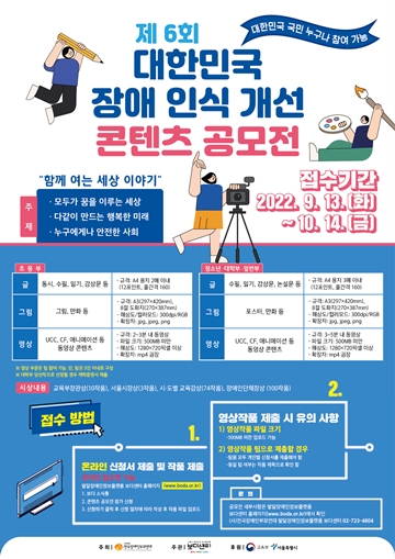 전국장애인부모연대가 오는 13일부터 10월 14일까지 ‘제6회 대한민국 장애인식개선 콘텐츠 공모전’을 개최한다.