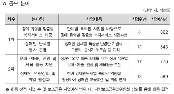 지원사업 1차 공모는 23일 오후 6시까지로 장애 유형별 맞춤형 복지서비스 제공 ▴장애인 단체별 행사 운영 분야를 대상으로 진행되며 결과는 2월 중 발표할 예정이다. 2차 공모 접수는 2월 10일부터 2월 20일 오후 6시까지로 ▴문화·예술·관광·체육활동 ▴장애인 역량 강화 및 취업 활성화 분야이다.