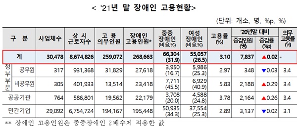 2021년 말 장애인 고용현황.ⓒ고용노동부 에이블포토로 보기▲ 2021년 말 장애인 고용현황.ⓒ고용노동부