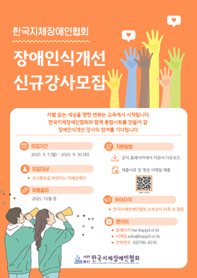 【에이블뉴스 권중훈 기자】 한국지체장애인협회(이하 지장협)가 오는 9월 1일부터 30일까지 장애인식개선교육의 전문성과 다양성을 강화하고, 사회 전반의 긍정적인 장애 인식 확산을 도모하기 위해 ‘2025년 장애인식개선교육 신규 강사’를 모집한다.