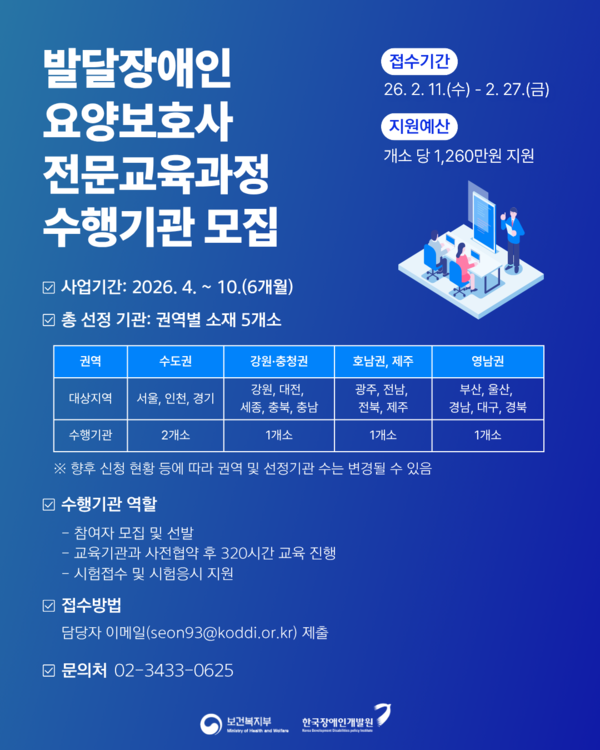【에이블뉴스 권중훈 기자】 한국장애인개발원(원장 이경혜, 이하 개발원)이 오는 27일까지 ‘2026년 발달장애인 요양보호사 전문교육과정(이하 전문교육과정)’ 운영을 위한 수행기관을 모집한다.
