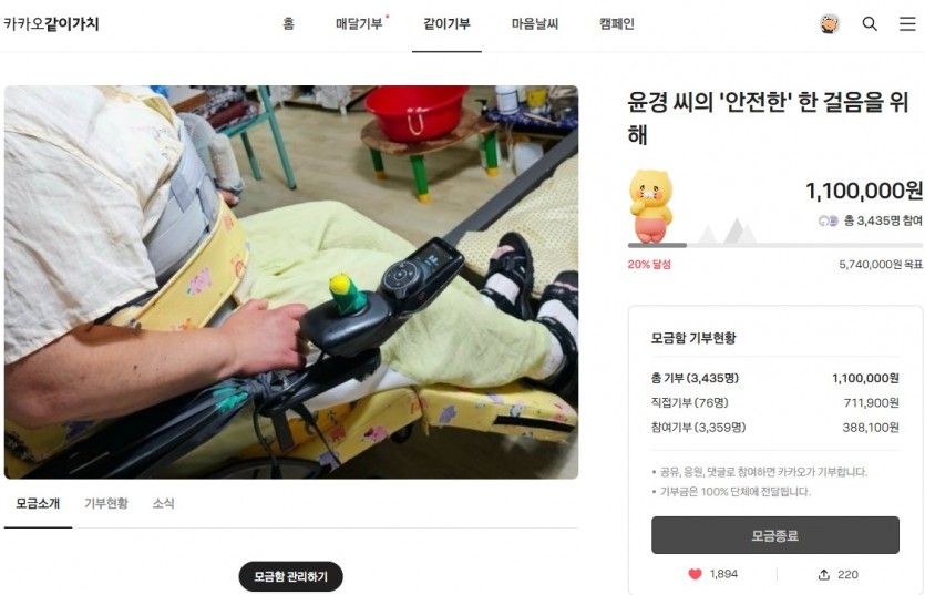 체구가 큰 윤경씨를 위해 안전하고 튼튼한 맞춤형 전동휠체어를 제작하고자 8월 14일부터 11월 14일까지 90일간 진행된 카카오 같이가치 모금함이 종료되었습니다.
