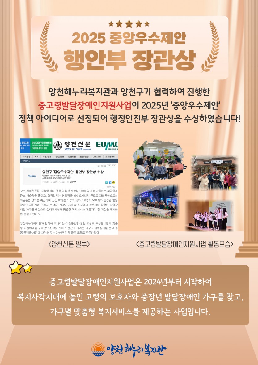 '중고령발달장애인지원사업' 2025 중앙우수제안 행안부 장관상 수상! 함께 축하해 주세요!
