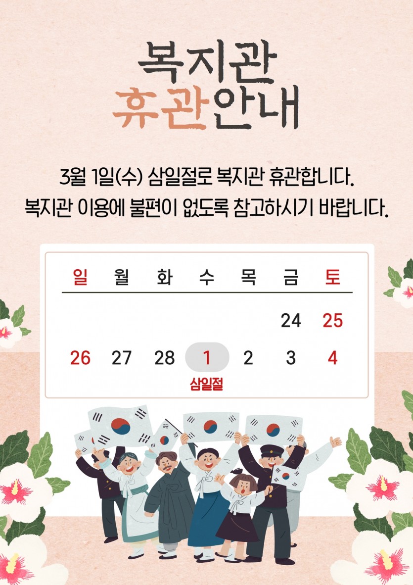 3월 1일(수) 삼일절로 인하여 양천해누리복지관이 휴관합니다.