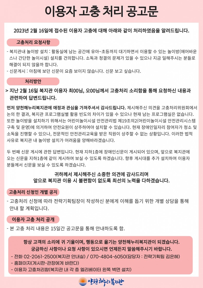 2023년 2월 양천해누리복지관 고객과의 소리함에 의견에 제시되어 이용자인권 및 권리지침 제5장 이용자고충처리 제25조에 의거 고충처리위원회를 실시하였고, 그 결과를  다음과 같이 공유합니다.