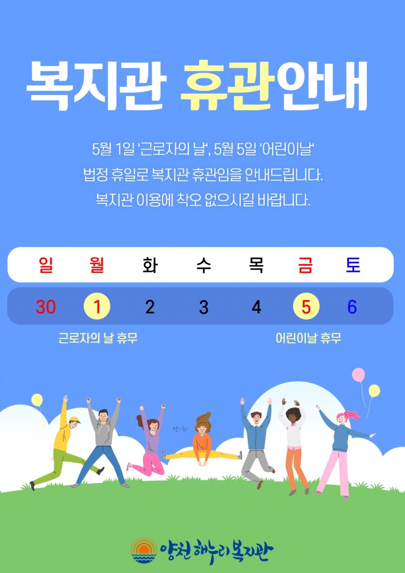 근로자의 날, 어린이날로 인하여 양천해누리복지관이 휴관합니다.
