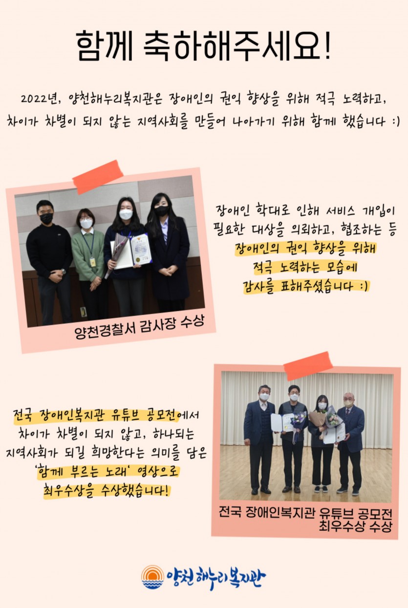 앞으로도 장애인의 살맛나는 세상을 위해 함께하는 양천해누리복지관이 되겠습니다