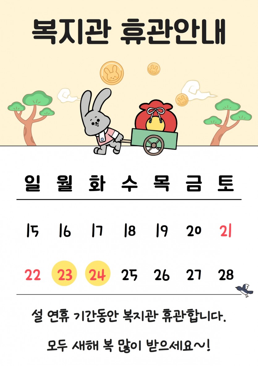 2023 설날을 맞이하여 설 연휴 기간동안에는 양천해누리복지관이 휴관합니다.