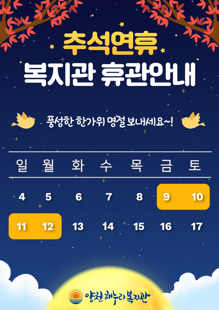 2022 추석을 맞이하여 추석 연휴 기간동안에는 양천해누리복지관이 휴관합니다.