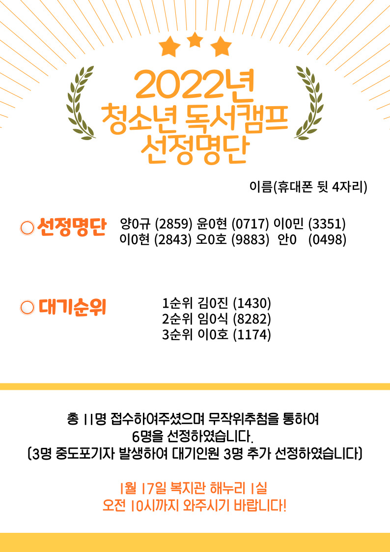 2022년 청소년 독서캠프 (여송사회복지재단 지원) 선정 결과를 알려드립니다.