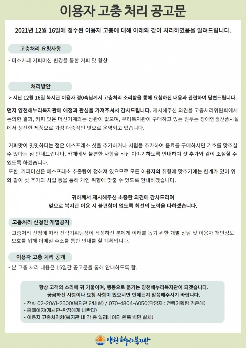 2021년 12월 16일에 접수된 이용자 고충 결과를 아래와 같이 안내드립니다.