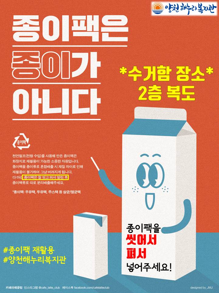 "다 마신 종이팩은 잘 씻고 펴서 말린 후 종이팩류로 따로 분리배출해주세요~"