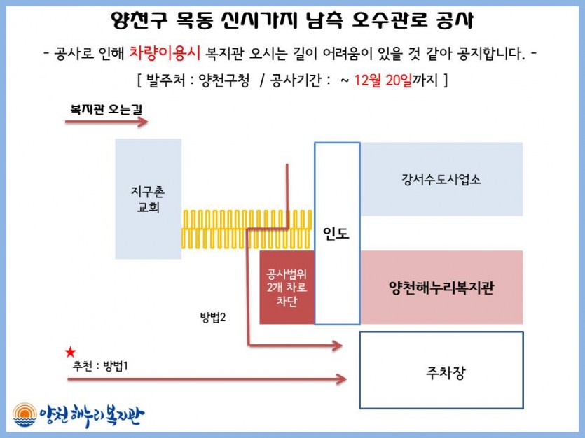 서울시 양천구 발주로 인해 "12월 20일까지" 복지관 입구 앞 오수관 공사가 진행됩니다.