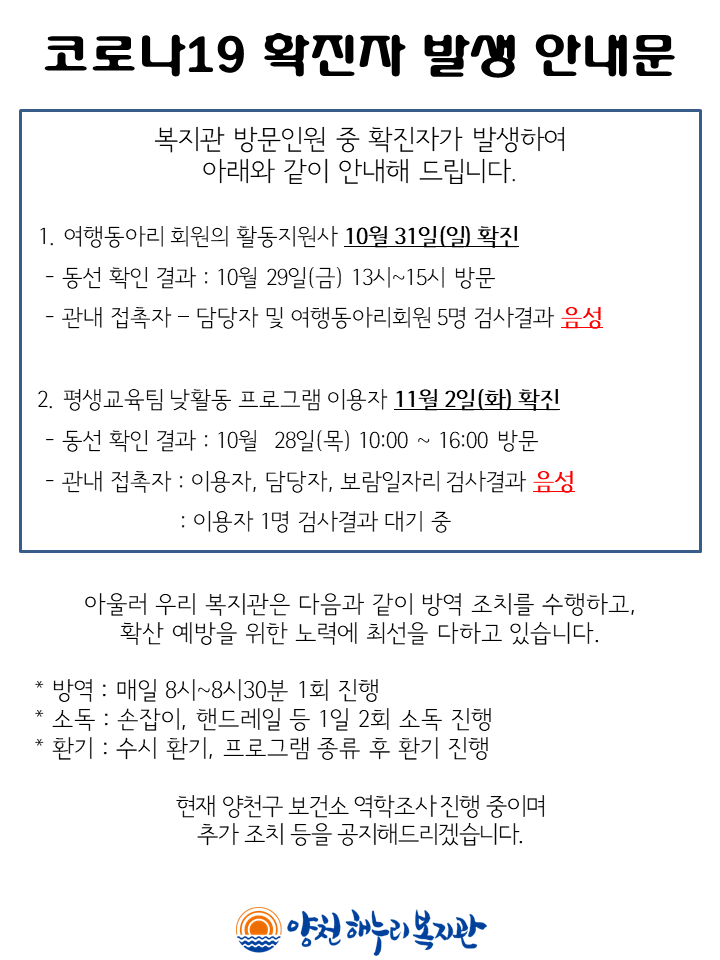 복지관 방문 인원 중 확진자가 발생하여 아래와 같이 안내해 드립니다.