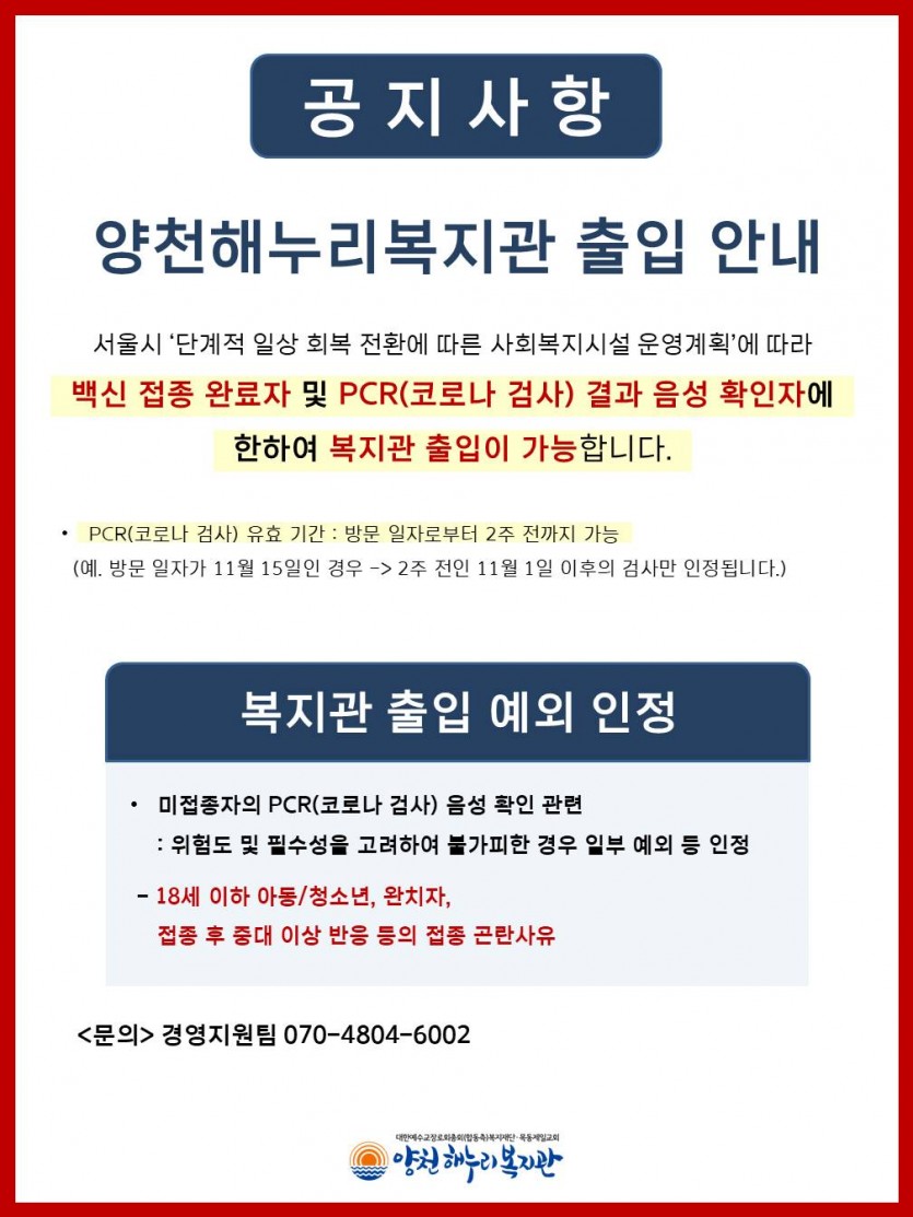 [공지] 양천해누리복지관 출입 안내