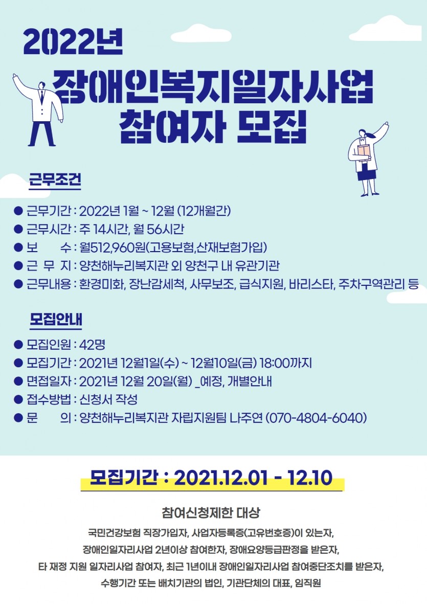 2021년 12월 1일부터 10일까지 장애인복지 일자리사업 참여자를 모집합니다!