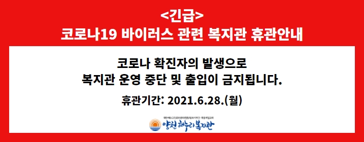 코로나 확진자의 발생으로 복지관 운영 중단 및 출입이 금지됩니다.
