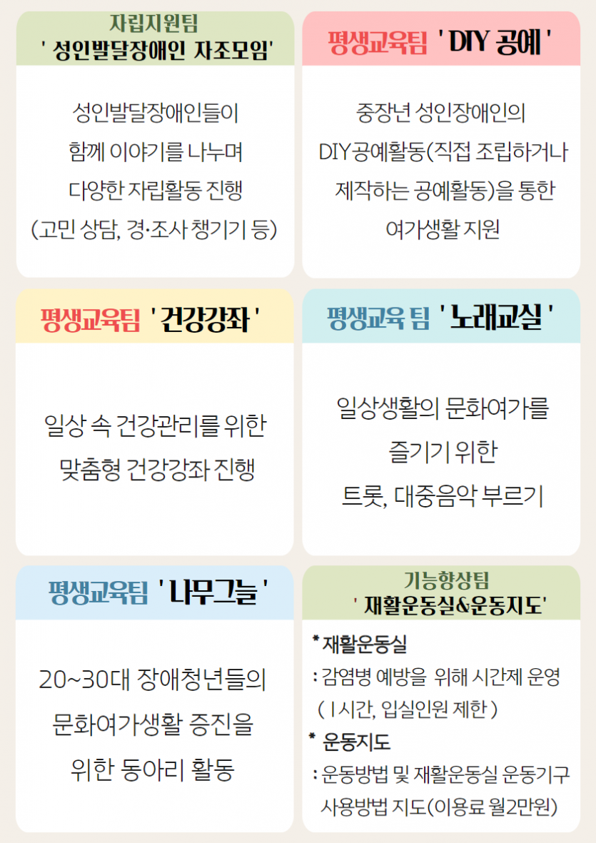 - 지역사회 내에서 스스로 살아갈 수 있도록 자립교육 및 훈련 프로그램 지원