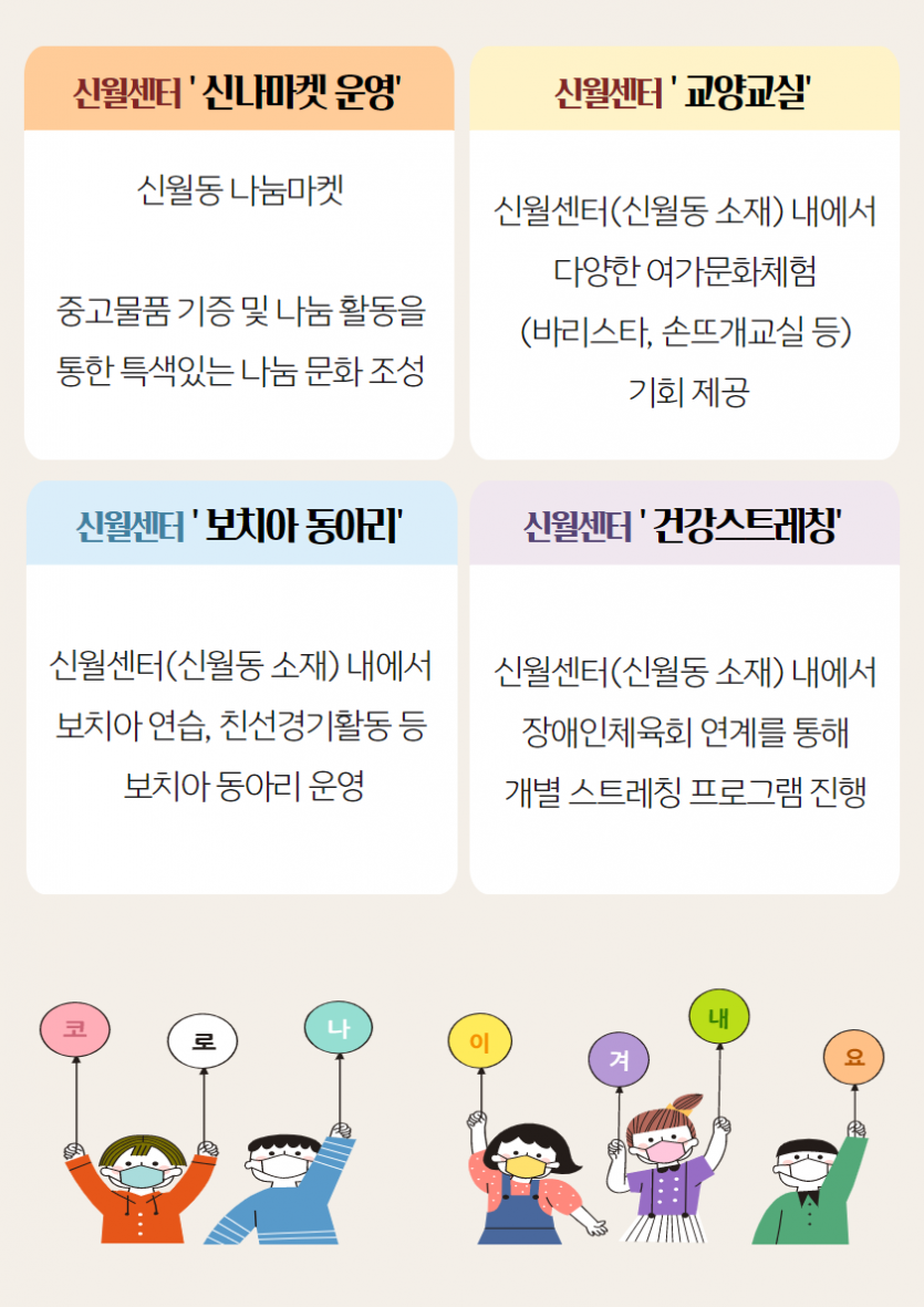 - 신월센터(신월동 소재) 내에서 다양한 여가문화체험(바리스타, 손뜨개교실 등) 기회 제공
