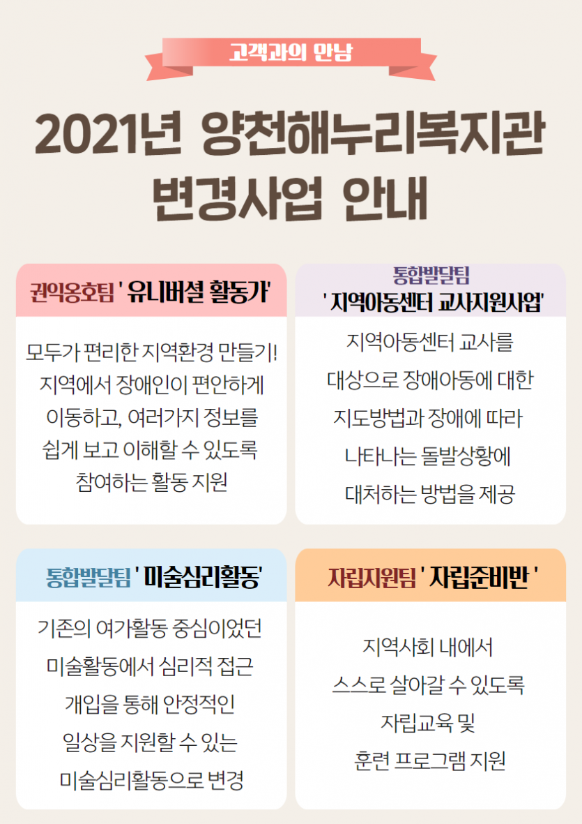 2021년 양천해누리복지관 변경사업 중심으로 안내하오니 참고하시기 바랍니다.
